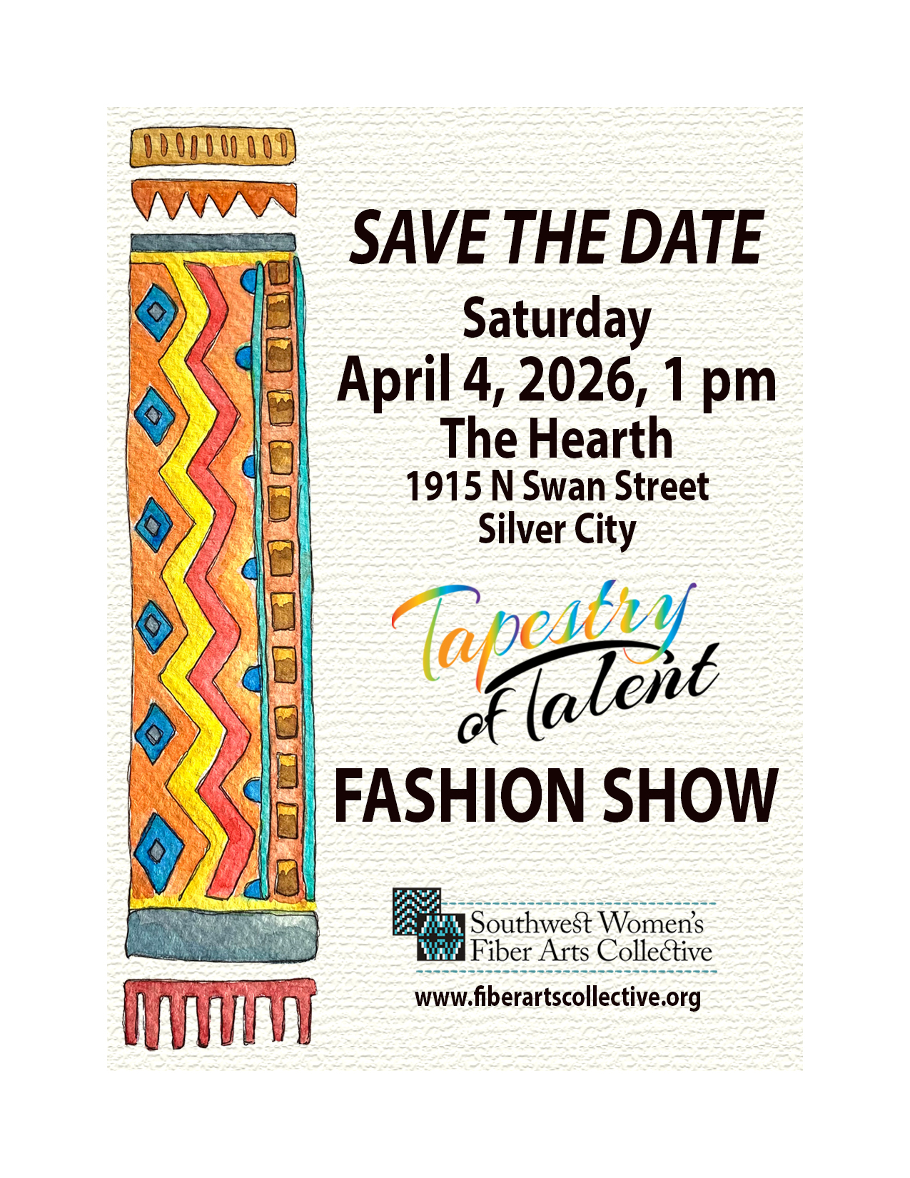 The Tapestry of Talent Fashion show fundraiser is April 4th featuring unique, one-of-a-kind garments! For the month of March, paper tickets will be available at two locations. 1) Silver City Tye Dye at the corner of Texas and Yankie Streets Thursday through Saturday from 12 noon to 4 pm. 2) SWAG Books and More on Wednesdays from 11 am to 2 pm.